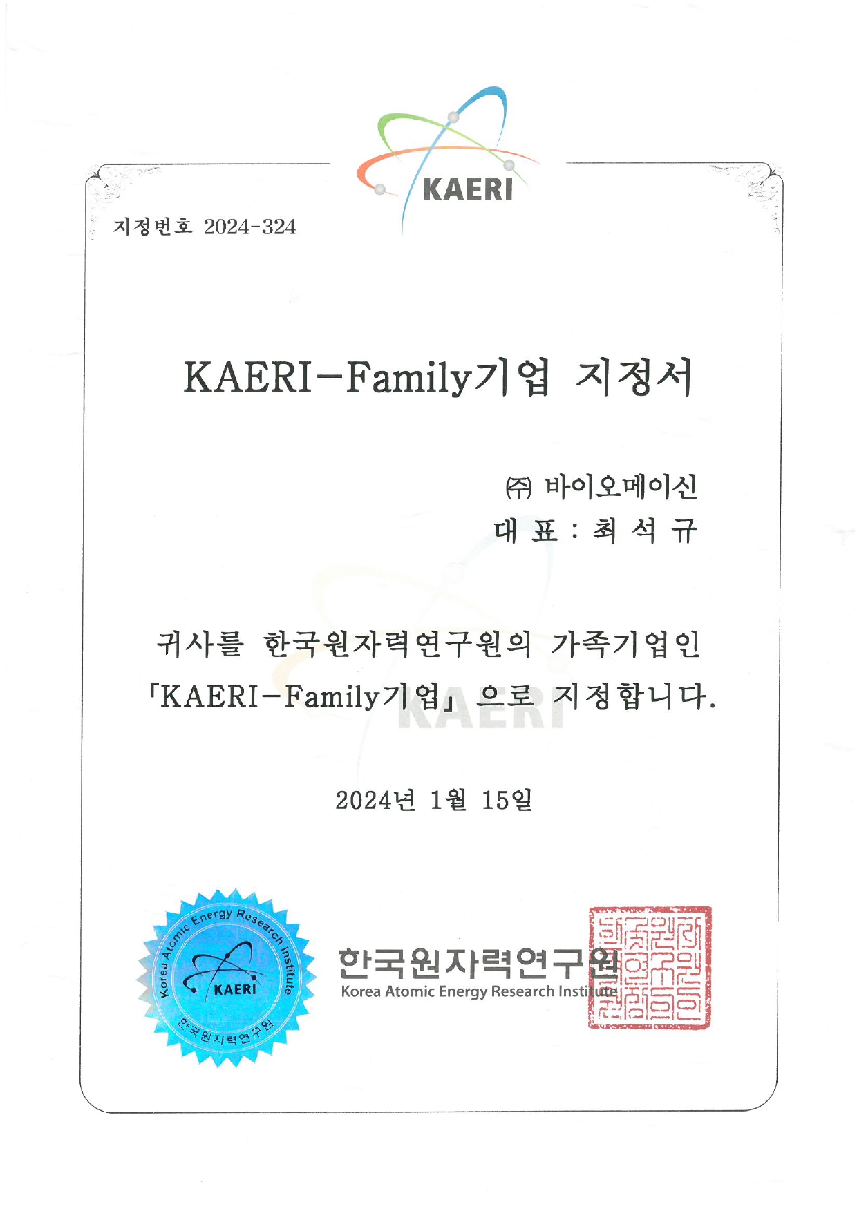 KAERI Family 기업 지정서_240115.jpg