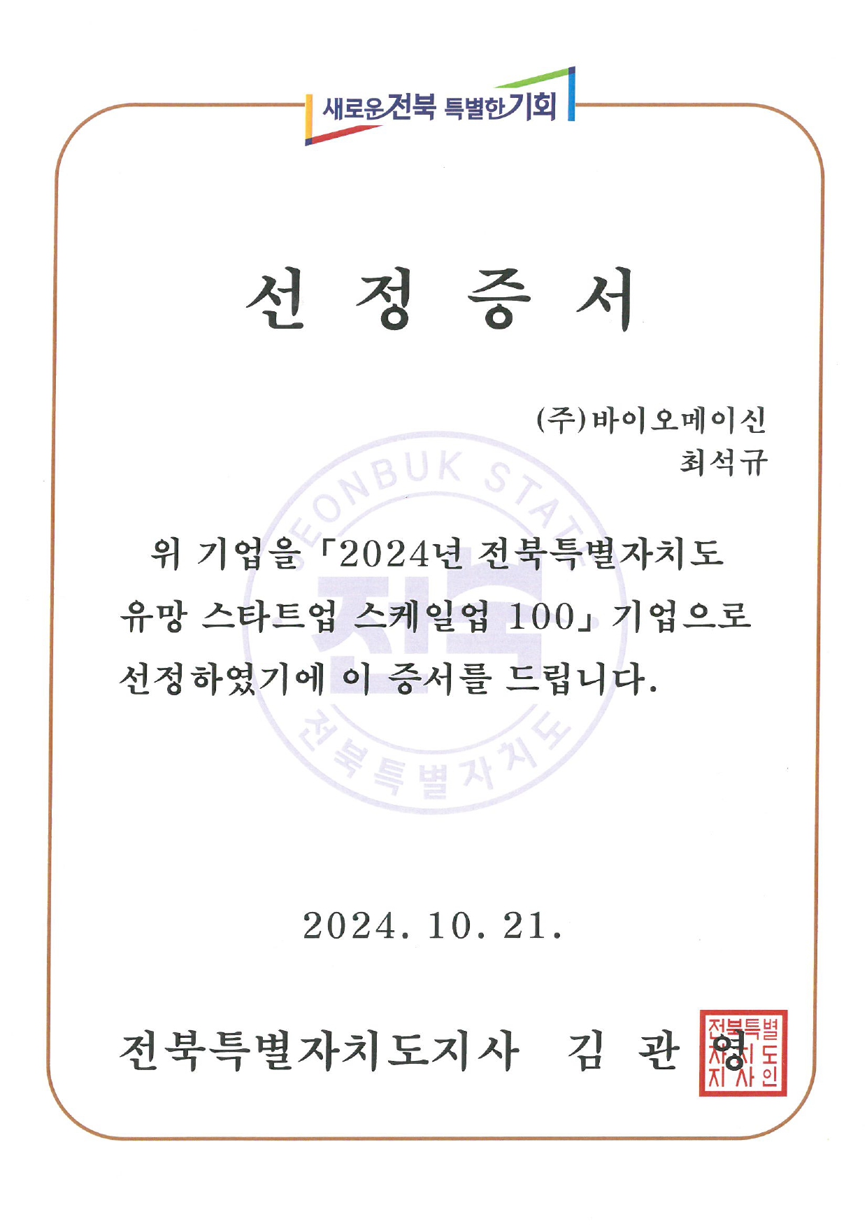 (주)바이오메이신, '24년 전북특별자치도 유망 스타트업 스케일업 100 기업으로 선정
